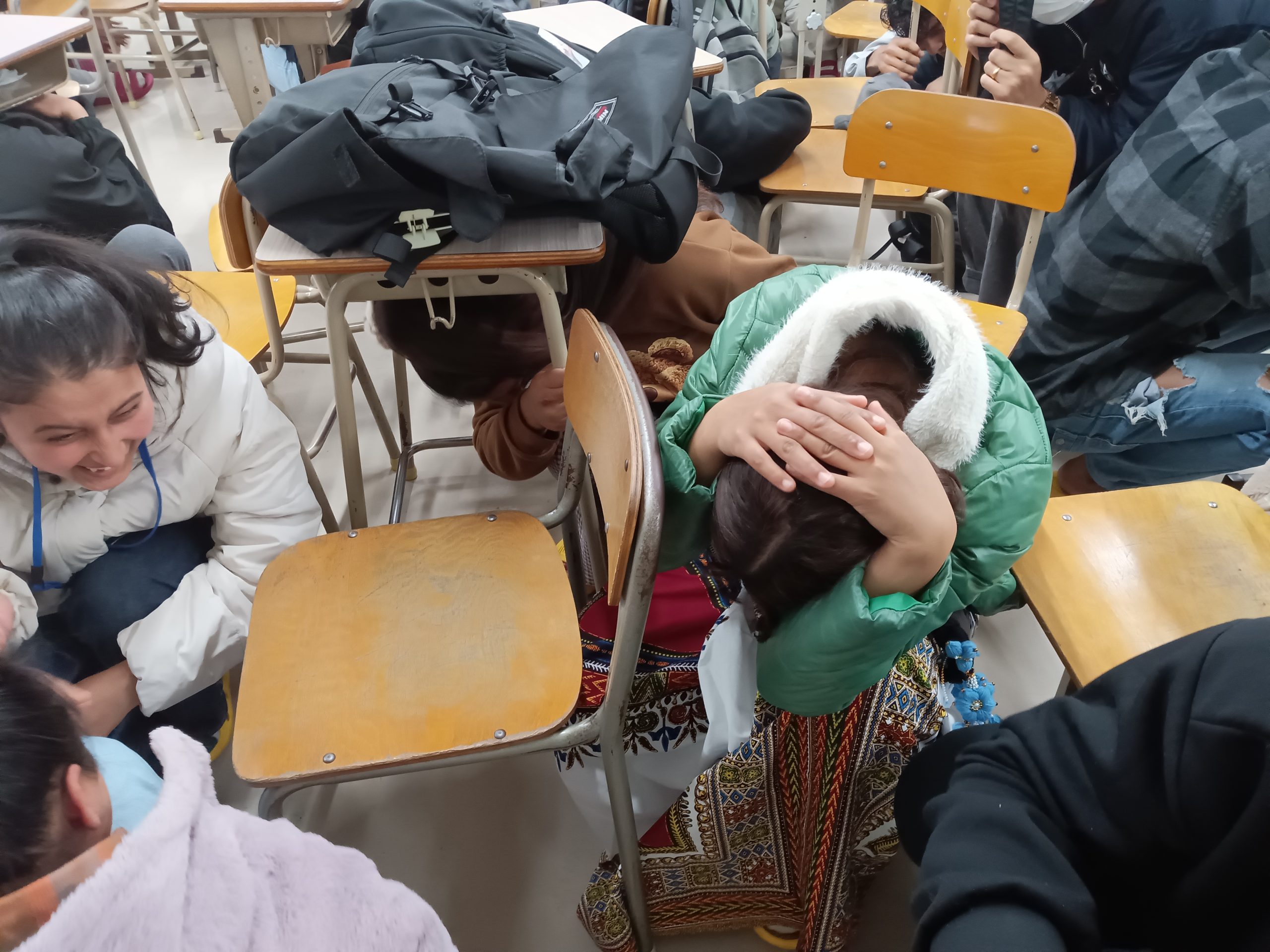 口元(くちもと)を服(ふく)の袖口(そでぐち)でおおい、先生(せんせい)の指示(しじ)をしっかり聞いていました😌
