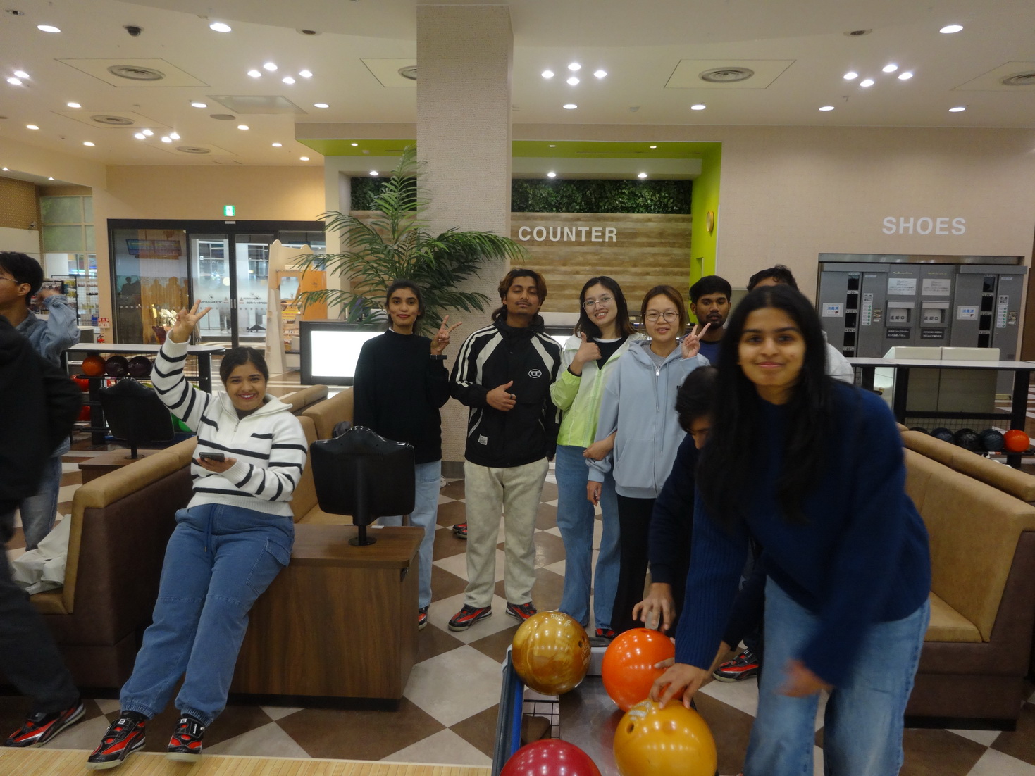 ボーリング場に着いて、クラスごとに写真(しゃしん)を撮(と)りました。みなさんがんばってください!