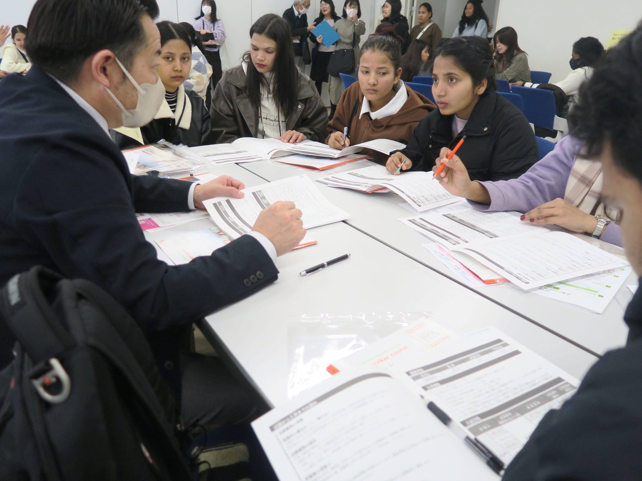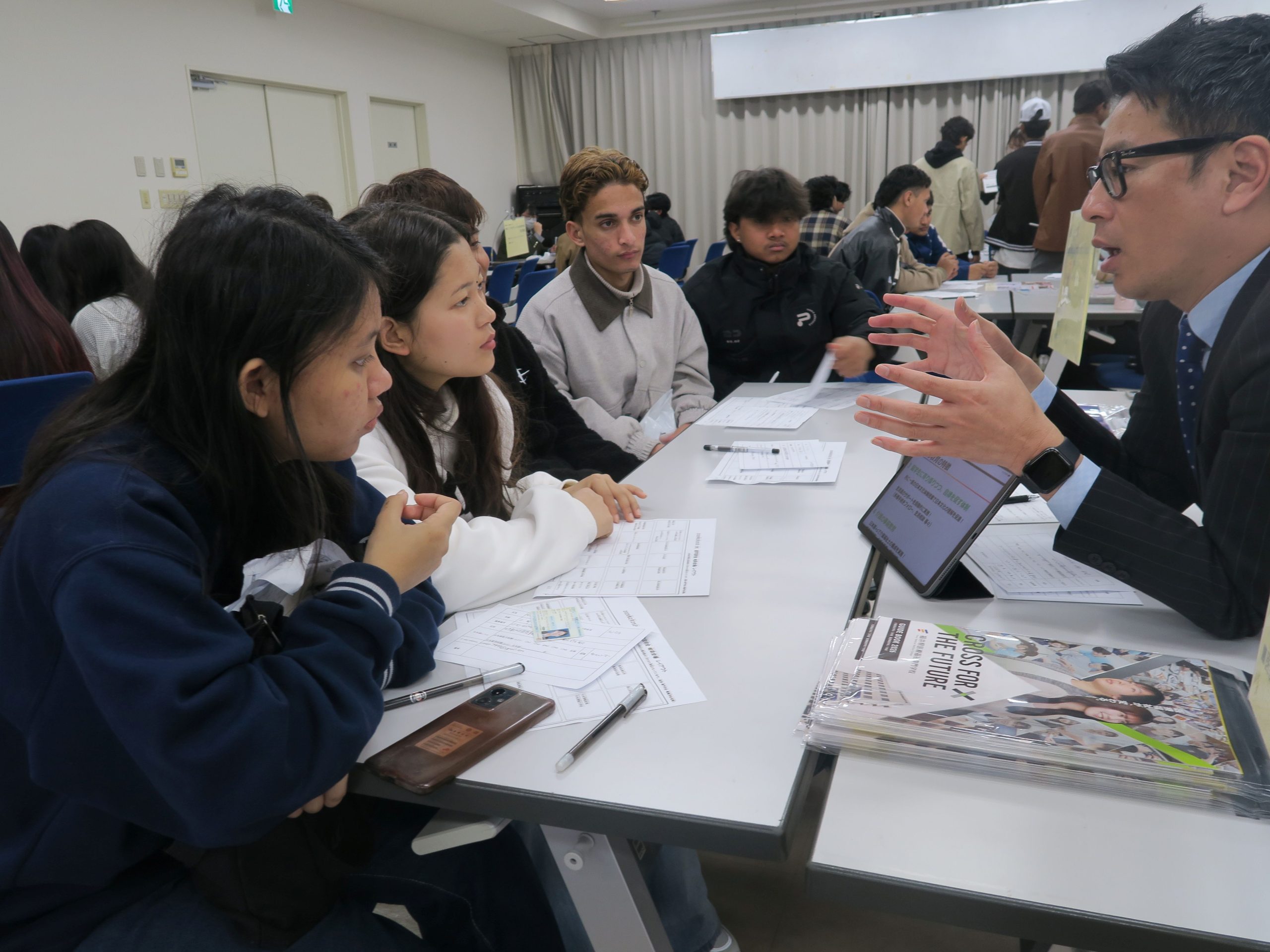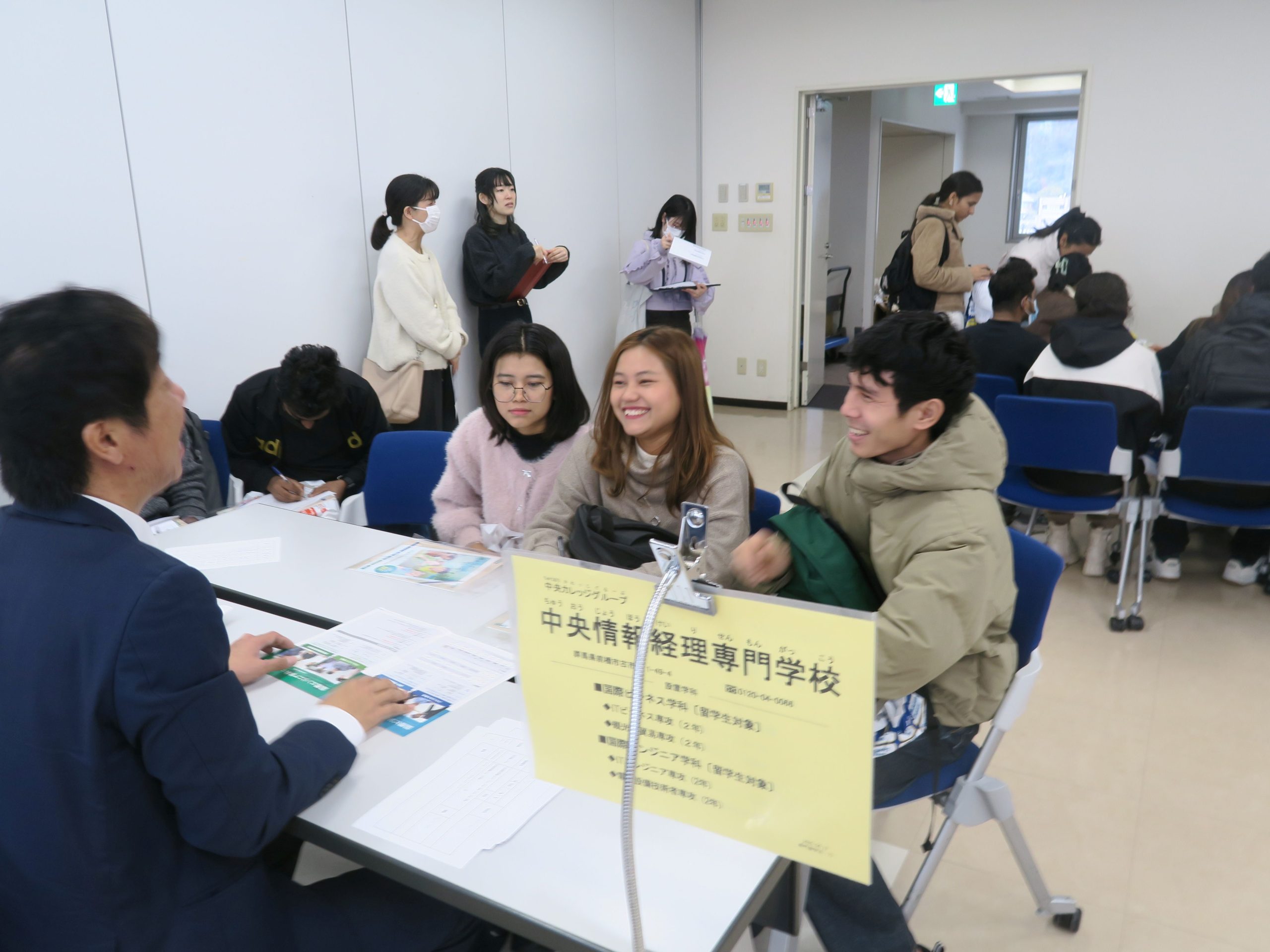 みんな、自分(じぶん)の進路(しんろ)に合(あ)わせて真剣(しんけん)に学校(がっこう)の先生(せんせい)の話(はなし)を聞(き)いていました。