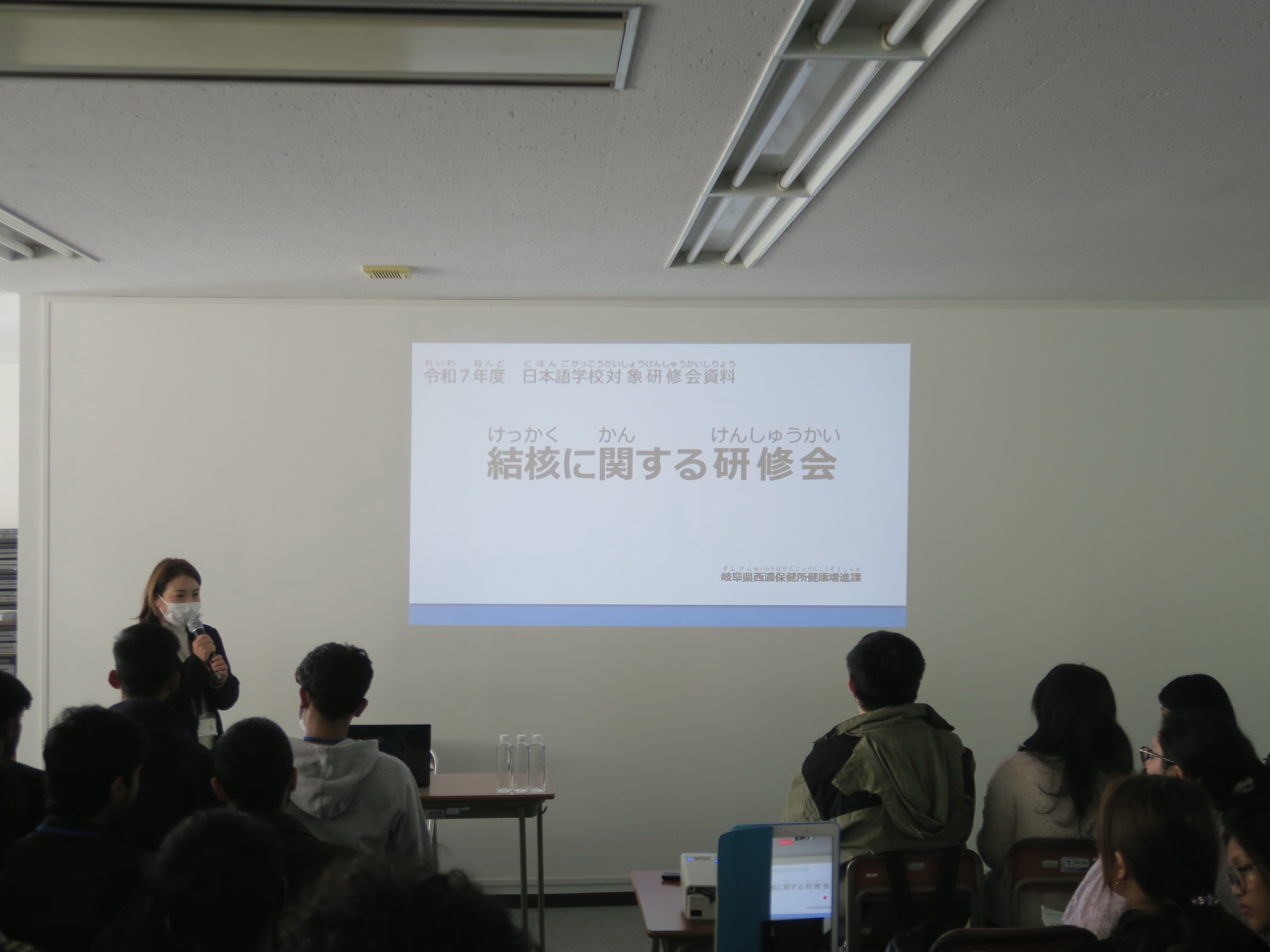 2025年11月14日、保健所(ほけんじょ、health center)から 結核(けっかく)予防(よぼう)研修(けんしゅう)を行(おこな)うために保健所の先生たちが、大垣校に来てくれました。
