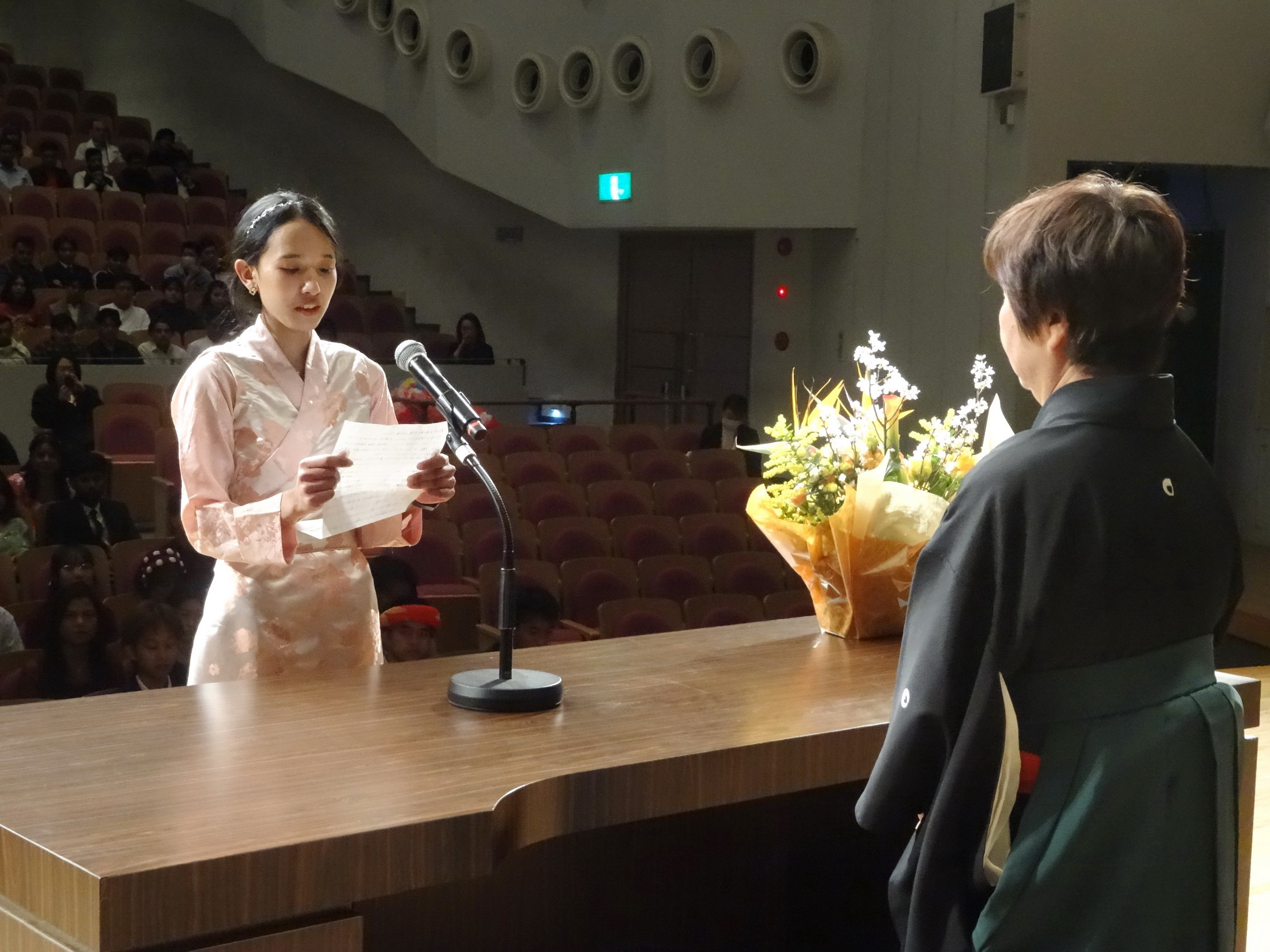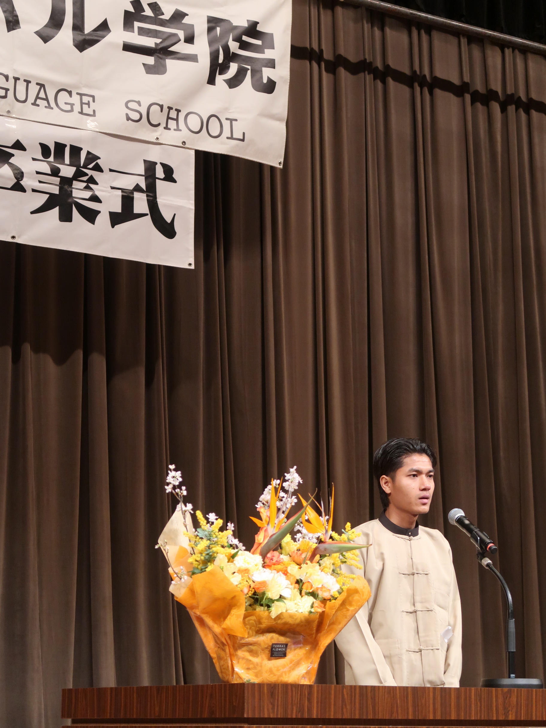 卒業生(そつぎょうせい)を代表(だいひょう)して A1 クラスの チョイサン さんが 答辞(とうじ)を述べてくれました。