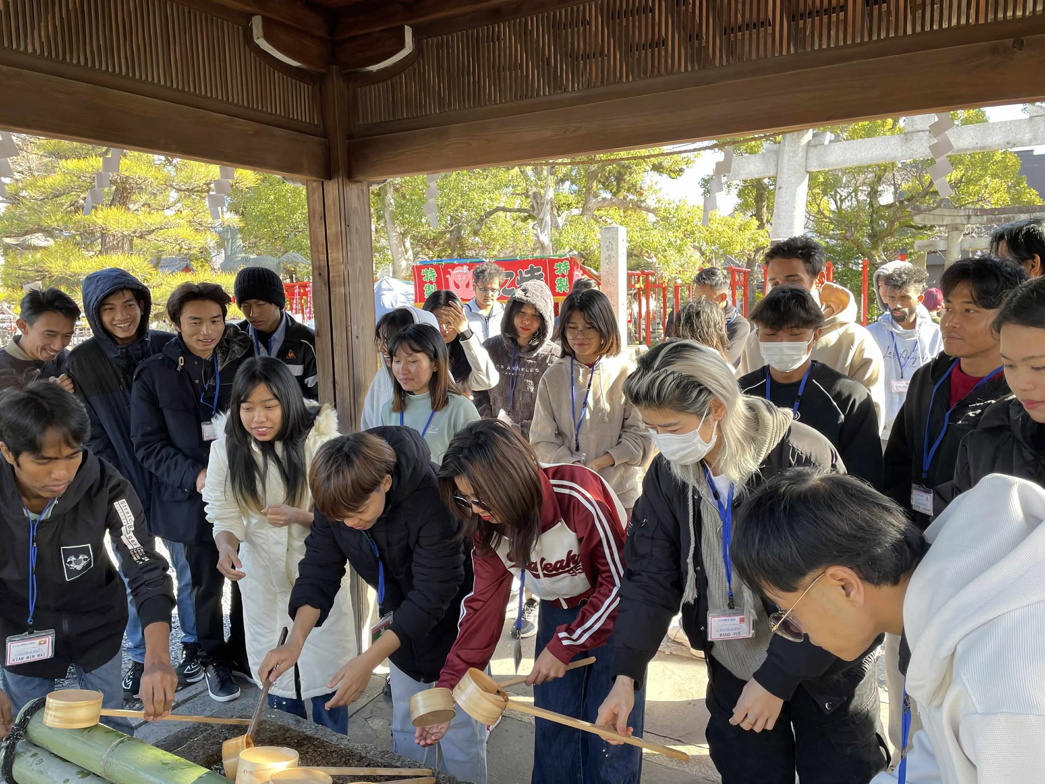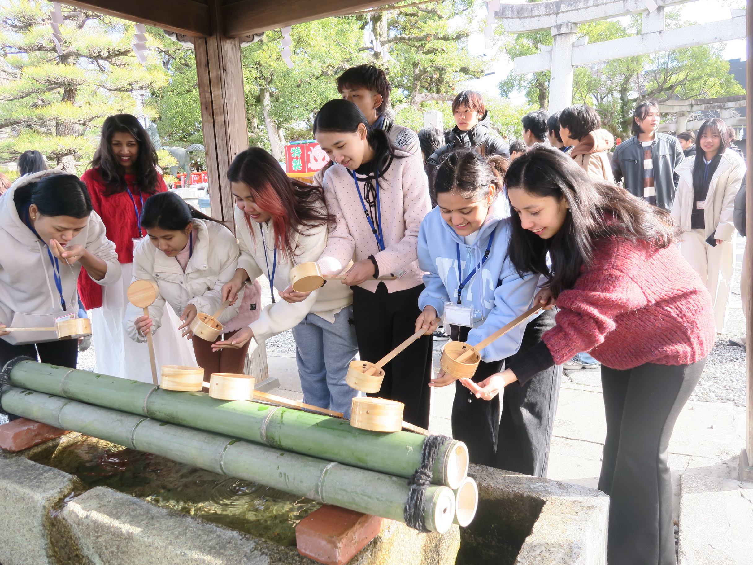 神社(じんじゃ)に着(つ)いて手水舎(てみずや)で手や口を清(きよ)めました。みなさん授業(じゅぎょう)で学(まな)んだ通(とお)りにできましたね。