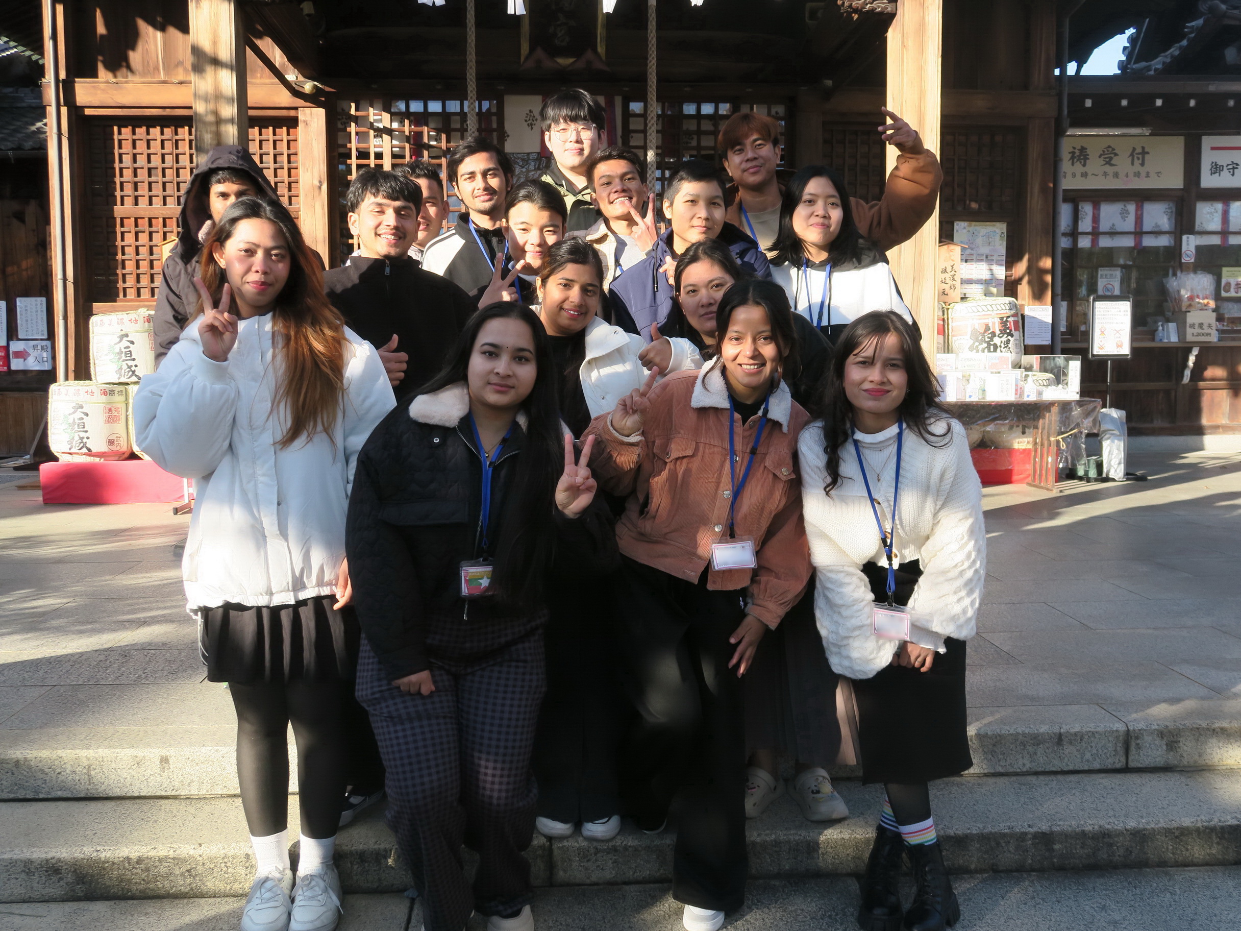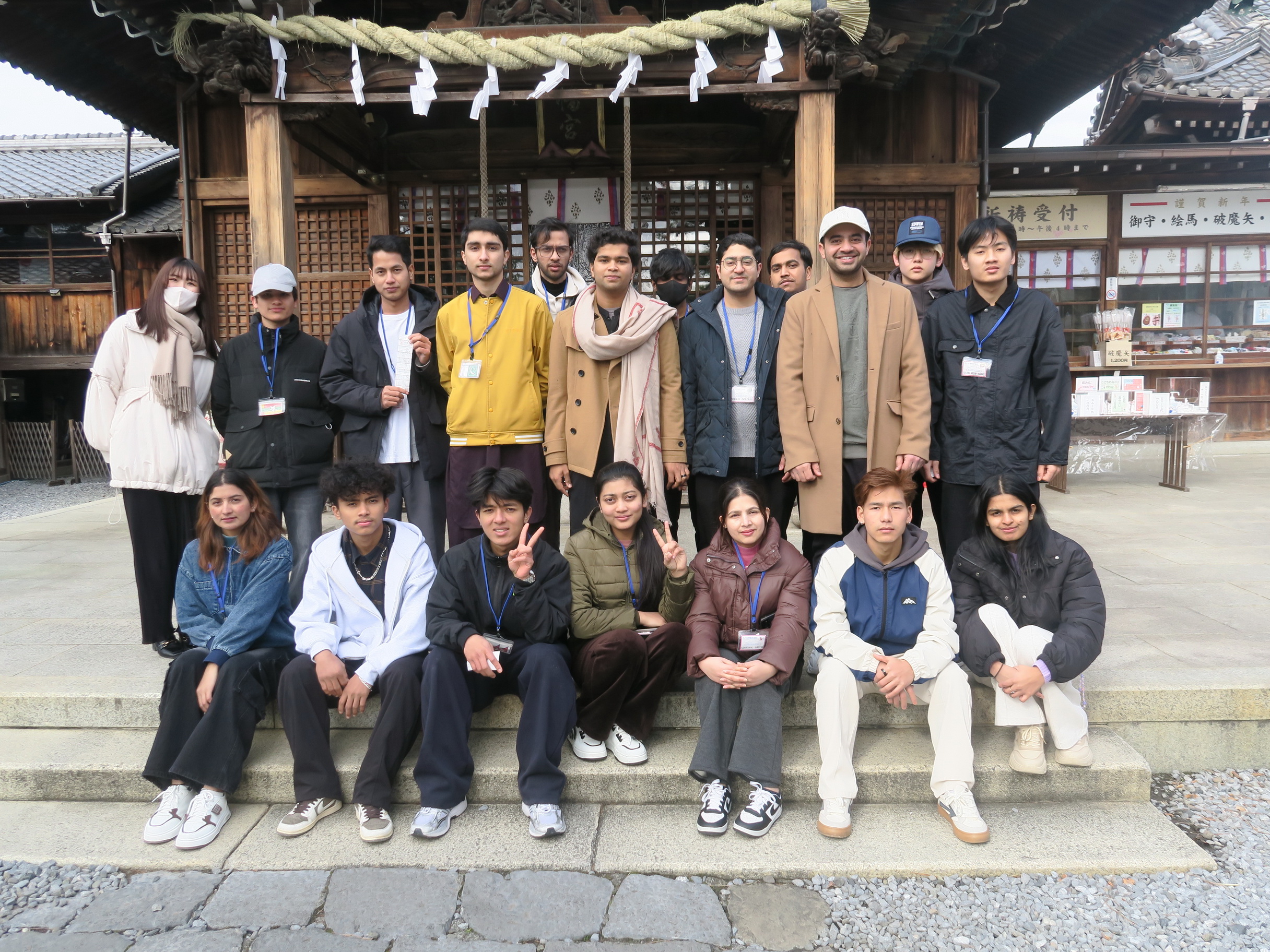 A1クラス と A2クラス のみんなでいっしょに神社の前で写真(しゃしん)を撮(と)りました。