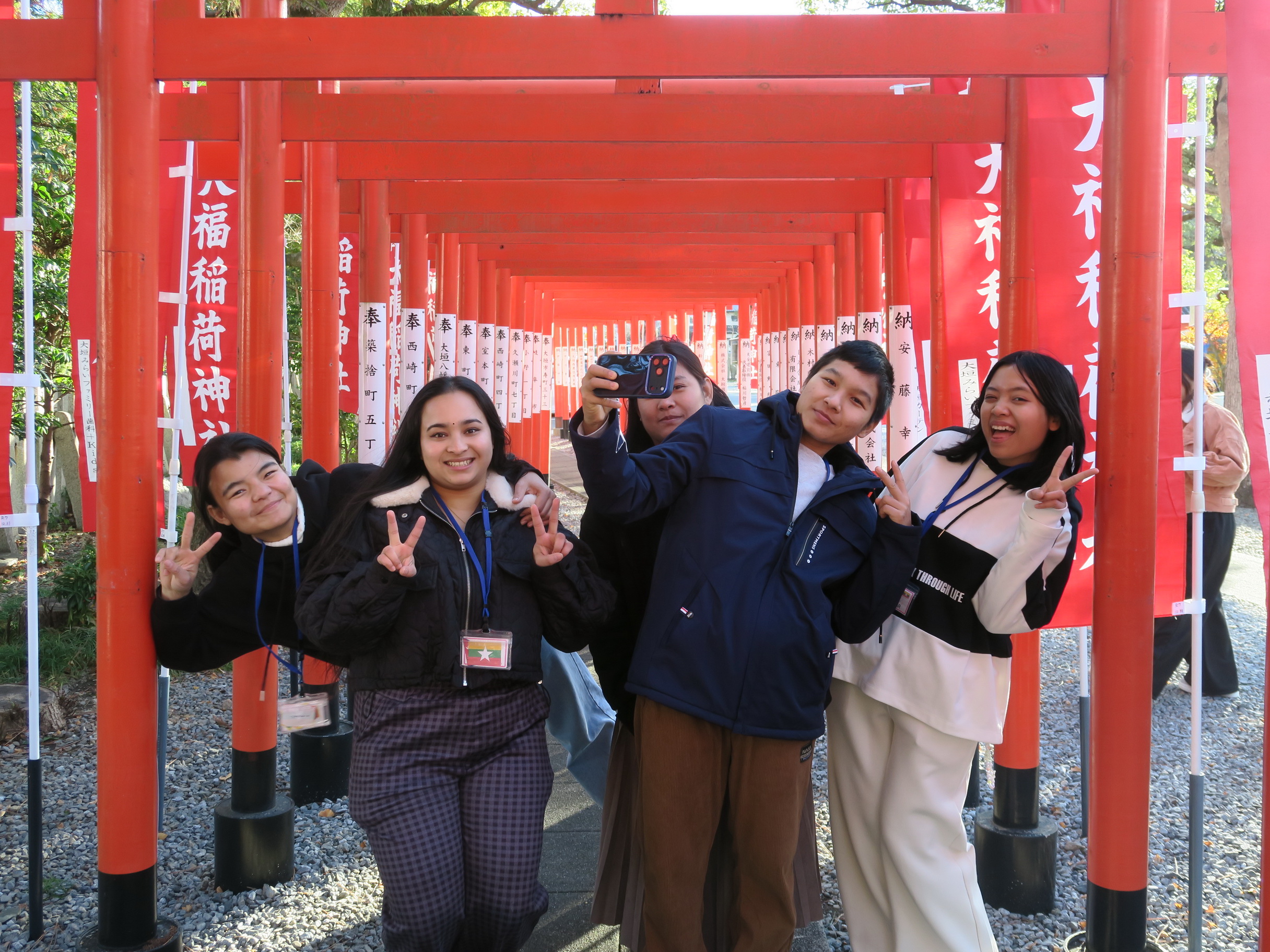 赤い鳥居(とりい)の前でみんなでポーズ!!