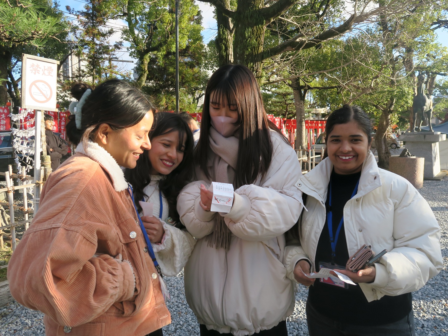 神社(じんじゃ)の境内(けいだい)ではみんな、お祈(いの)りをしたり おみくじを 引いたり、友達(ともだち)と一緒(いっしょ)に写真(しゃしん)を撮(と)ったりしました。