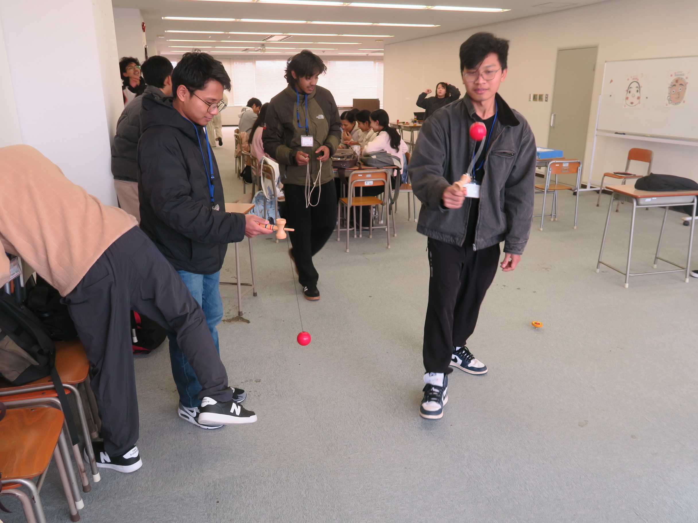 初詣(はつもうで)から学校に帰ってきて、日本の お正月(しょうがつ)の 遊(あそ)びを 体験(たいけん)しました。