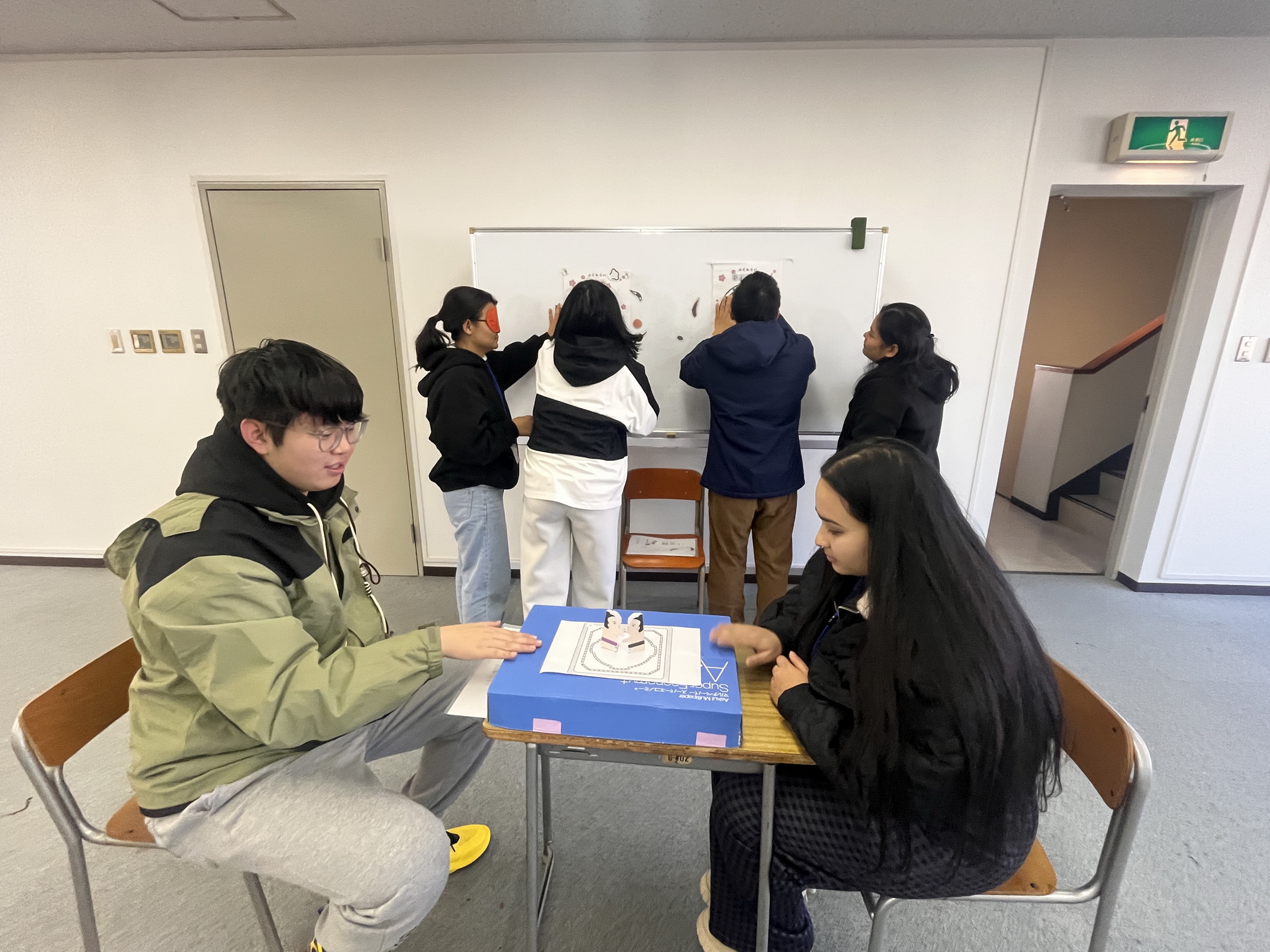 ふくわらい と 紙相撲(かみずもう)で遊びました。ふくわらい ではおかしな顔ができてしまい、みんなで笑いました